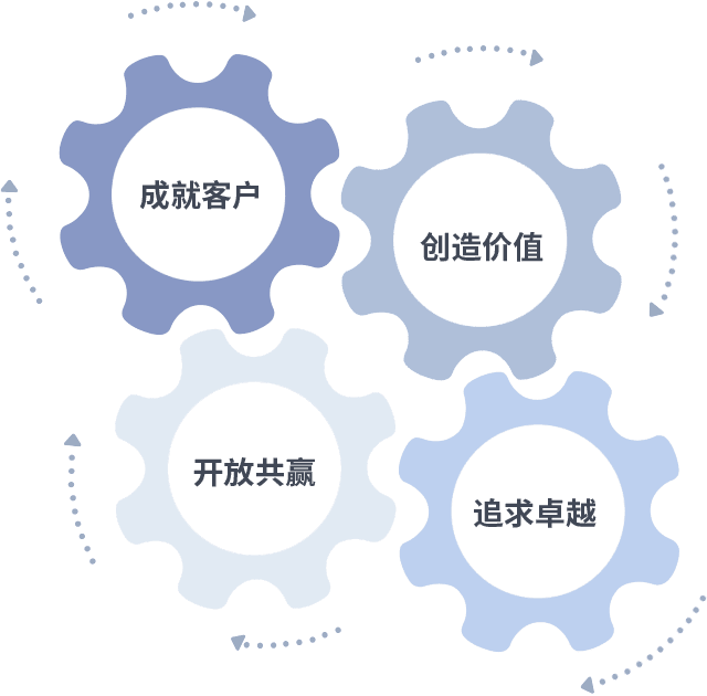成就客户是一切决策的出发点,,,创造价值是衡量所有工作的标准,,,追求卓越是我们做事做人的态度,,,开放共赢是我们的格局也是最终的结果。。。价值观的齿轮环环相扣,,,推动着组织里的每个人不断向前。。。