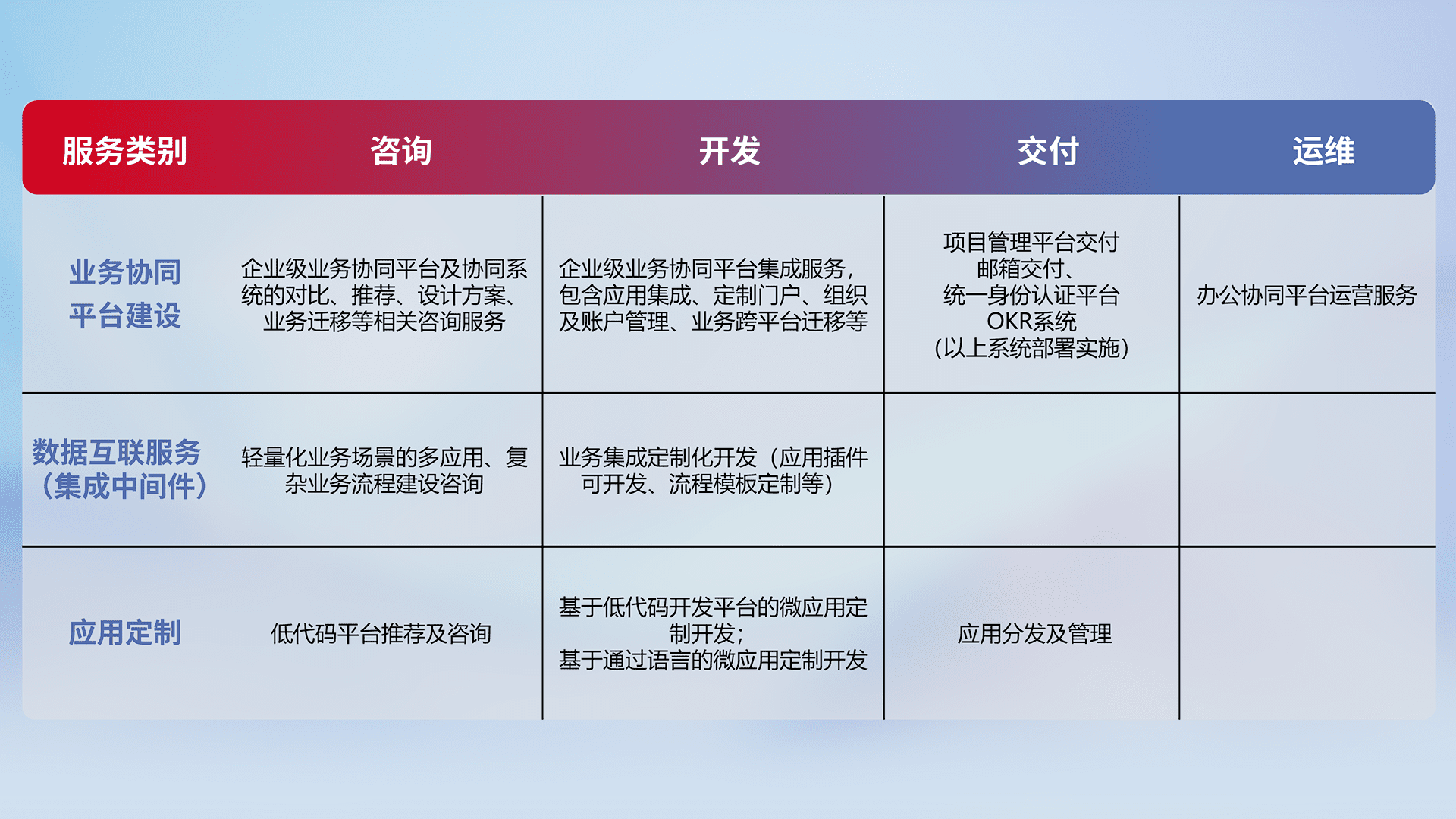 针对钉钉、、、企微、、、IDaas等平台级产品提供产品的规划、、方案、、交付、、、、定制化开发等服务,,实现如统一协同办公、、智能客户服务、、、、混合会议管理、、智能数据查询、、、等业务场景,,,实现数字化转型。。。。